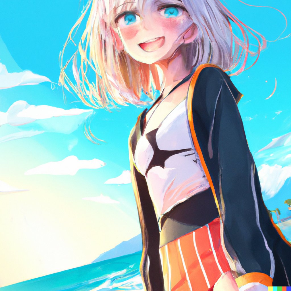 DALL-Eが使える様になったので実験。A anime girl at the beach in summerと他のワードを組み合わせてこんな感じ。ググるのと一緒で適切なワードをいれないと目的に近い物がこない。1文で指定した方がもっといい結果がでるんかな…?