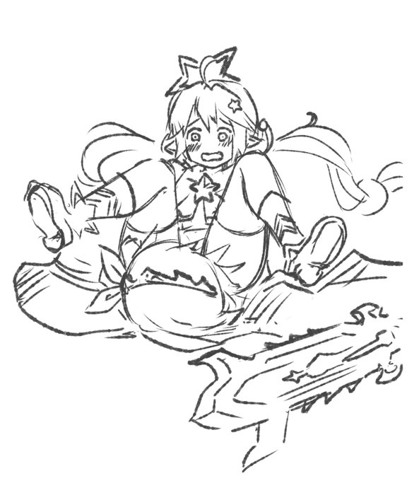 おやすみ何かの飾り付けをする学院マーリンちゃんのラフ なお足元には脚立とベディヴィーくんがセットされています