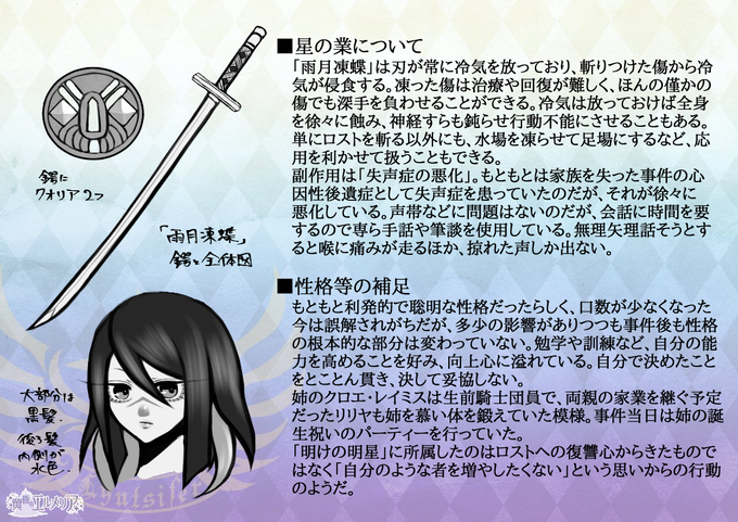 「明けの明星」獅子宮所属の日本刀少女。過去は重いですが割と元気です。
