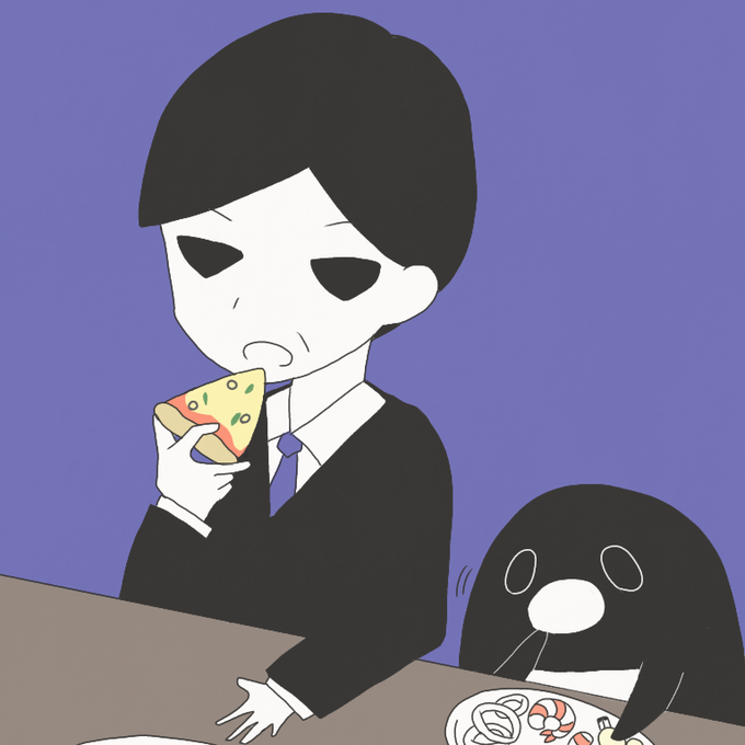 シーフードピザのシーフードだけ食べるペンギン🐧 シーフードピザの余ったピザを食べる上司👔