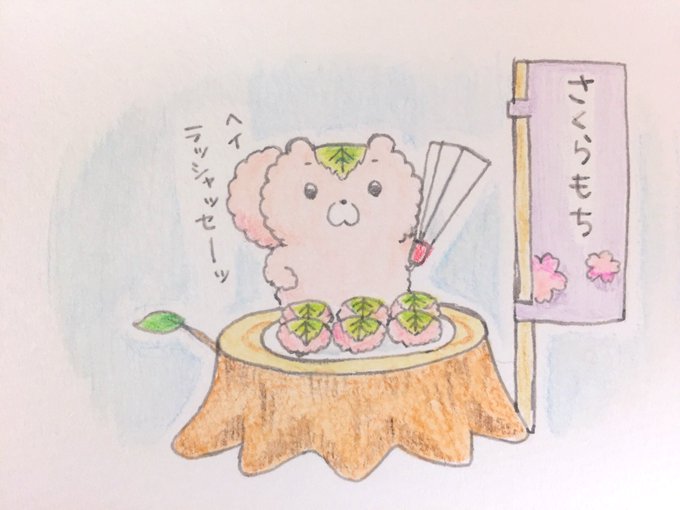 桜餅りすは桜餅売ってます🌸 値段は書いてないけど、お気持ちでどんぐりを何個か欲しいそうです🐿 #桜餅 #桜餅りす #水彩色鉛筆 #自作キャラクター