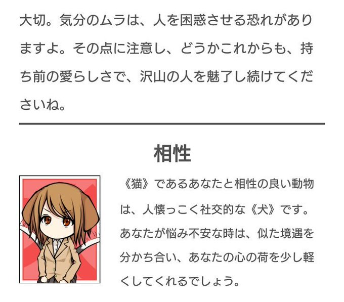 動物キャラ診断したらネコさんだった 何となくそんな気がした笑 気分のムラはリアルだけだな~ まぁマイペースやな笑