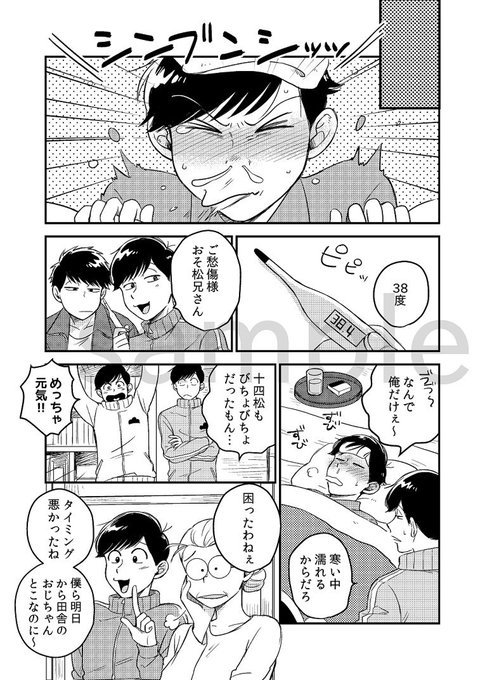 1/28 家宝(秒速)の新刊サンプルです。 『熱は僕らをバカにする。』 おそ松が風邪を引いて看病することをきっかけに煮え切らなかった2人がくっつく話。長いのはこちら→https://t.co/RLX3Udm8ob