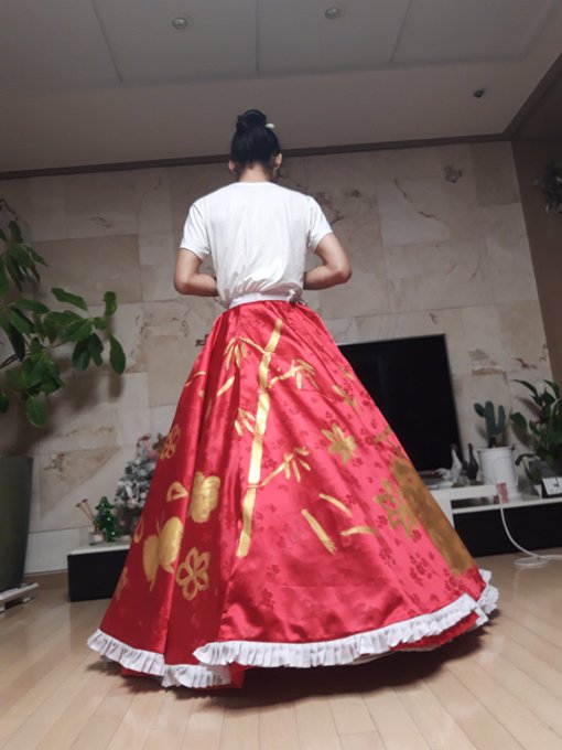치마완성;; 그림빡세게 그리고 한복원단이라 원단폭이 좁아 후레아를 조각내어 이어붙여 만듦. 프릴은 역시 손주름 프릴. 치마에는 당연히 안감내장.