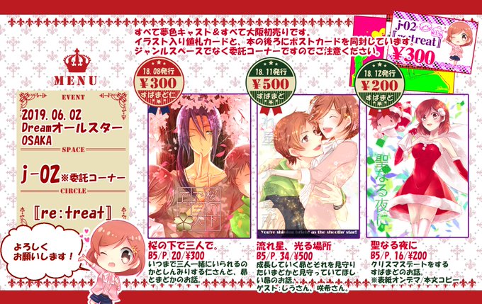お品書き作りましたー。不備が無ければ委託コーナー j02 re:treat(りとりーと)で頒布されていると思います!全部夢キャス、すばまどとすばまど仁です。3種類までなので2月の仁まど本はまた次の機会に…。