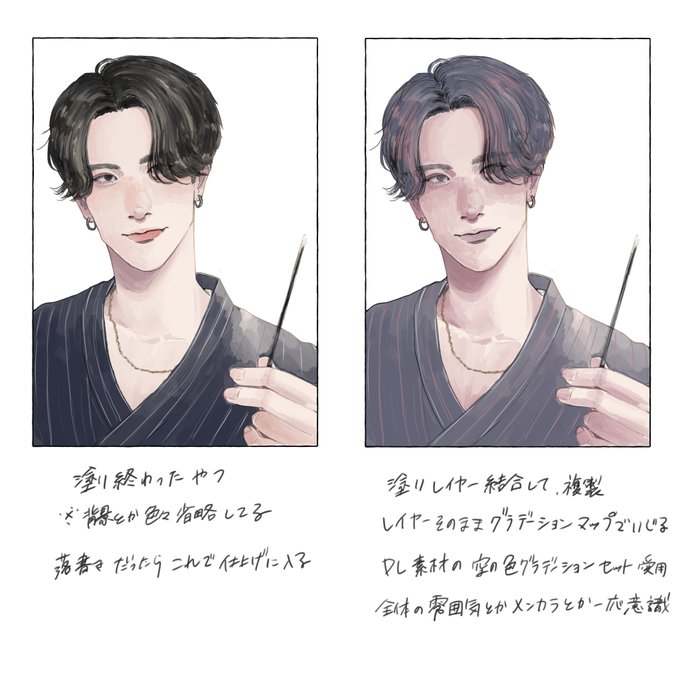 9.絵の工程の仕上げの細かい話 グラデーションマップで加工大好き😄 DL素材を有難く使わせて頂いてる🙏 合成モードをオーバーレイで使うこともあるけど最近はほとんど通常で色が残るように?してる 青系使いがちだけどスマホで見た時の顔色の悪さに笑う()