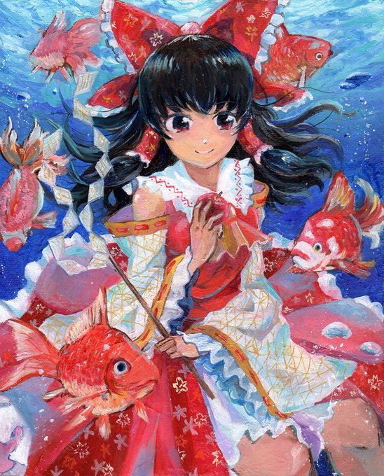 『霊夢と金魚』 油絵で描きました!はじめて描いた油絵のリメイクです。 明日のコミケで展示販売しますので、是非見に来てください! 同じ霊夢コスで松崎しげるん(@runrun_sigerun)に売り子してもらうよ! はりねずみ屋さん【ヤ-08a】でお待ちしてます。