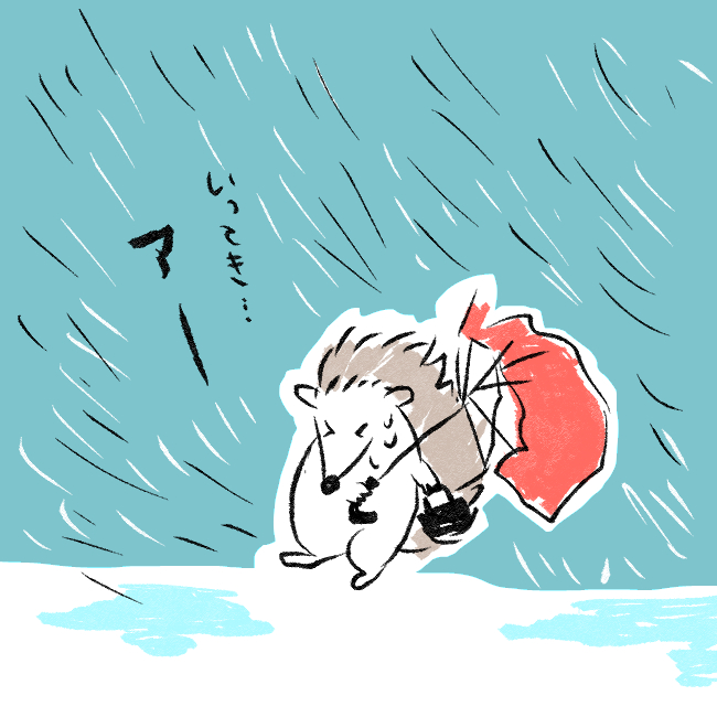 家を出て秒で傘が壊れるハリネズミ #ゆるいイラスト
