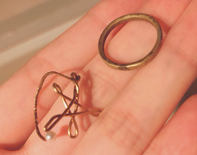 @choco_kimetsu 1枚目、リング(どっちも手作り) 2枚目、イヤリング 真鍮とか真鍮っぽいデザインが大好きです🥰