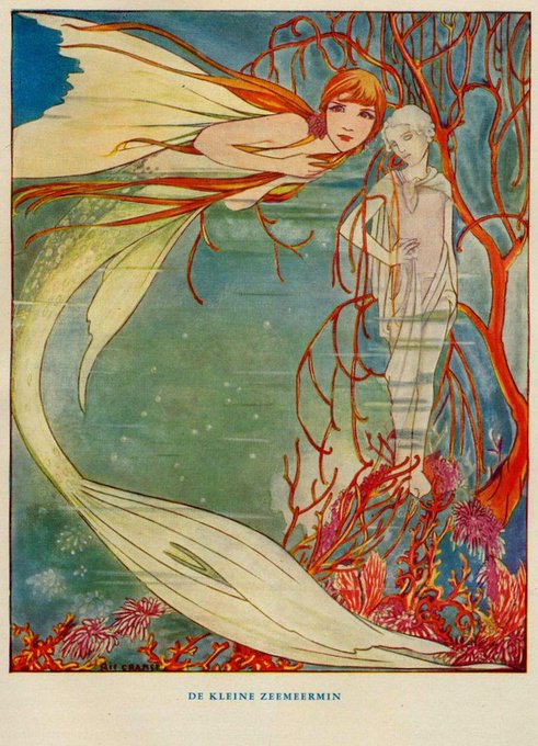 赤毛の人魚:アンドレア・ダンカン・カース (1876-1938)画の人魚姫(1912)。初見の時はデュラックかと思って驚いた。デュラックの人魚姫(1911)からの影響かしら?でもカースのイラストも素敵♡