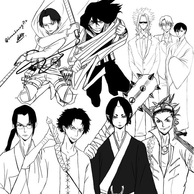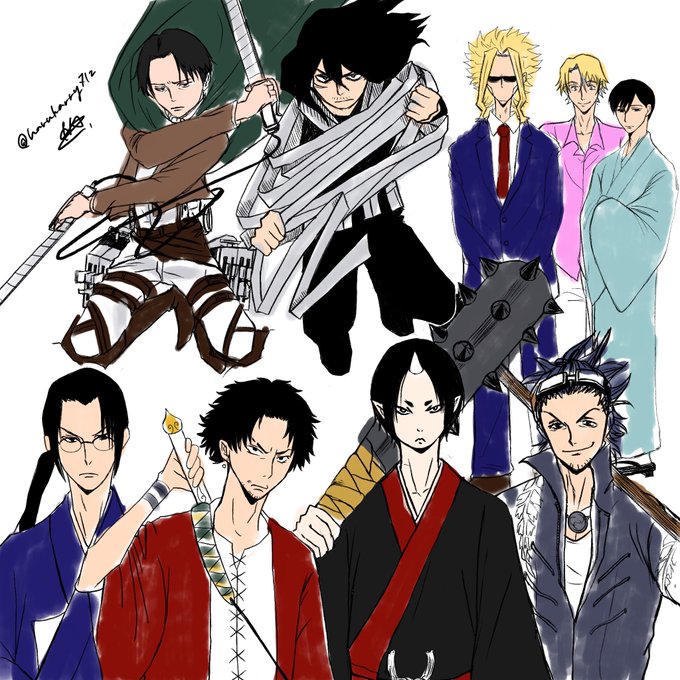推し詰め2020年8月現在 色塗り前に集中力死にました 下左から ジン サムライチャンプルー ムゲン サムライチャンプルー 鬼灯さま 鬼灯の冷徹 日本号 刀剣乱舞 上左から リヴァイ兵長 進撃の巨人 相澤先生 ヒロアカ オールマイトTF ヒロアカ ローラン GREAT PRETENDER 菊比古さん 昭和元禄落語心中