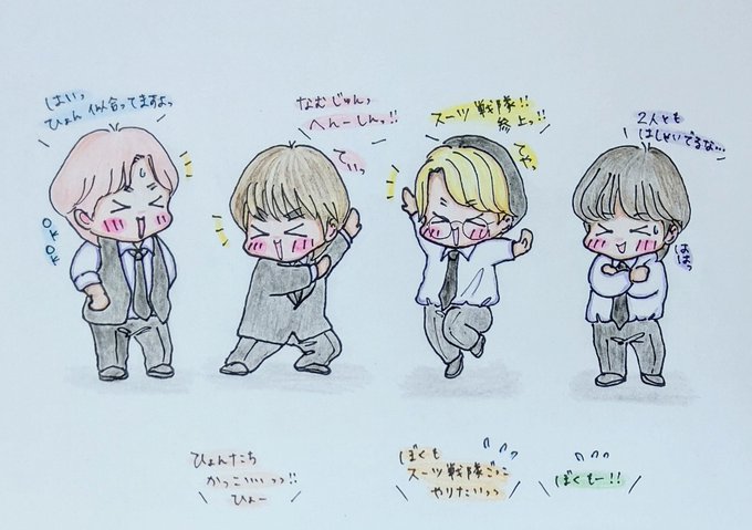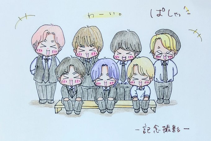 昨日はマンネラインに UNGAでのパフォーマンス時のスーツを着てもらいましたが。 今日はヒョンラインバージョン追加🥰 そして、皆でぱしゃり記念撮影です✨ 今日も沢山の癒しと活力をありがとう、バンタン✨ #UNGA #방탄소년단 #btsfanart #BTS