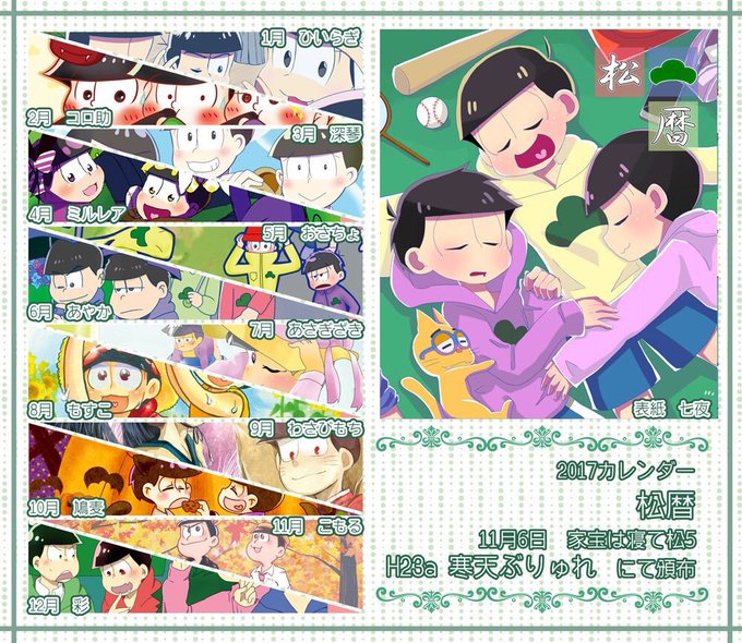 11月6日 家宝は寝て松5 H23a「寒天ぶりゅれ」さんで2017年松カレンダーが2つ出ます!!!どの絵もすっっっごく可愛いくて松愛に溢れてます〜(((o(♡´▽`♡)o)))私は1月担当させてもらいました!!よろしくお願いします!