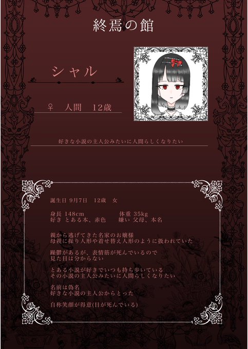 #終焉の舘_名簿資料 人間のシャルちゃんです〜❕ ちょっと立ち絵が雑… 不備ありましたらリプにお願いします🙇♀️