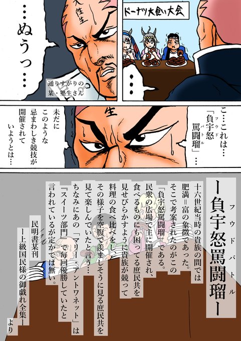 ドーナツ大食い大会+イッテQ #漫画 #イッテQ #宮川大輔 #オグリキャップ(ウマ娘) #タマモクロス(ウマ娘) #ウマ娘プリティーダービー #雷電(魁!!男塾) https://t.co/j3OROwZV2Z