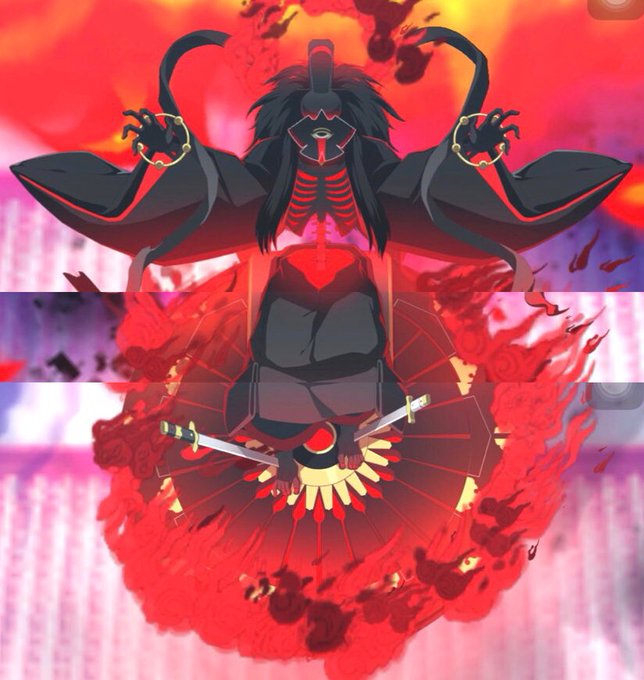 道満の宝具で喚ばれる顕光殿のデザインが気になったのでスクショを切り貼り。 ダークなデザインよな、とは思ってたけどよく見たら足に剣が刺さってらぁ…傘か火車に固定されてる? 顔は結局よく分からないけど、式神?の下に人の顔は有りそうな気も 黒い太陽?は和製マッドボールだな #FGO