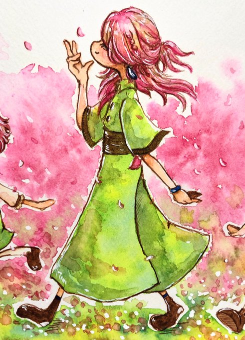 はるのあしおとちゃんたち、各アップです〜🌸歩いたところから春がくるよ 桜の木みたいになるように描きました☺️楽しかった〜