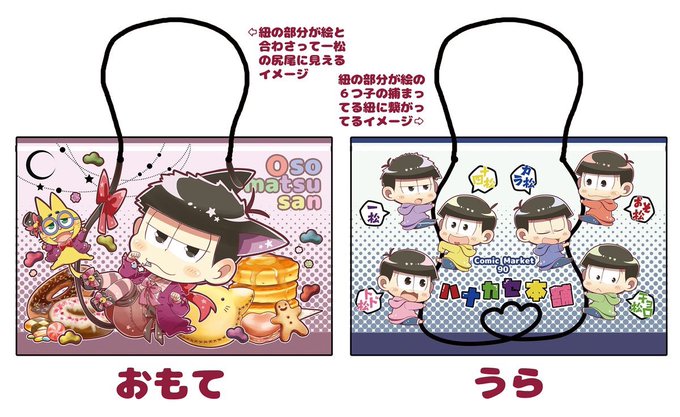 本垢の方にも流しましたが夏コミの新刊セット辺りに使う予定の紙袋イメージ出来ました...!表は紐が一松の尻尾に見えるような感じに、裏は紐が6つ子ちゃんの掴まってる紐に見える感じに...これに新刊とちょっとしたグッズが付く予定です。