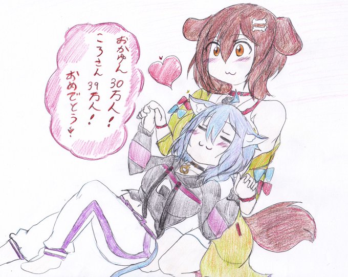 #できたてころね #絵かゆ #おかころ #戌神ころね ころさん42万人おめでとう♪(おかゆんのしっぽを首に巻くころさんの絵)
