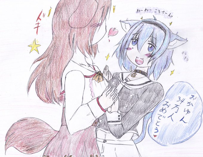 #絵かゆ #できたてころね #おかころ #猫又おかゆ おかゆん34万人おめでとう♪(甘え声出しながら指を絡めてくるおかゆんにドキドキするころさん。おかころ絵)