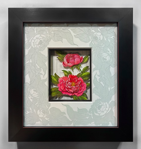 Nicole Grosjean @nicolegrosjean, "June Peonies", Cut Paper, Watercolor, and Etched Glass, 7.5 x 8 in, on view through April 30th 2022.
