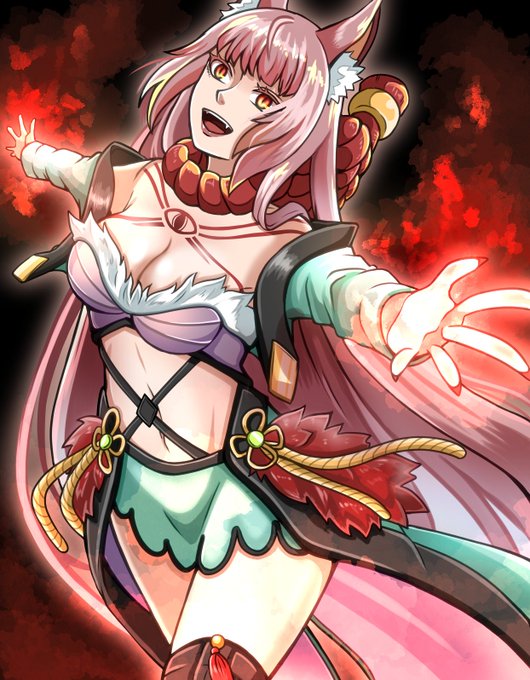 神話系のイラスト多いけどこの3枚目までは襲名制で各自お付がいます。ミコトは天照の次の候補です。 4枚目のメギは負の感情に支配された九尾の妖狐と言う設定です。