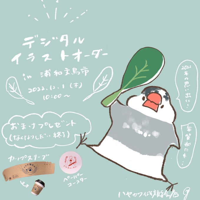 #浦和文鳥市 12月1日、文鳥のデジタルイラストオーダ会します! お渡しまで数週間お時間いただいてしまうかと思いますがよろしければぜひ!(о´∀`о)🥬✨ オーダーいただいた方にコースターorカップスリーブをプレゼント(忘れたらごめんなさい) #文鳥
