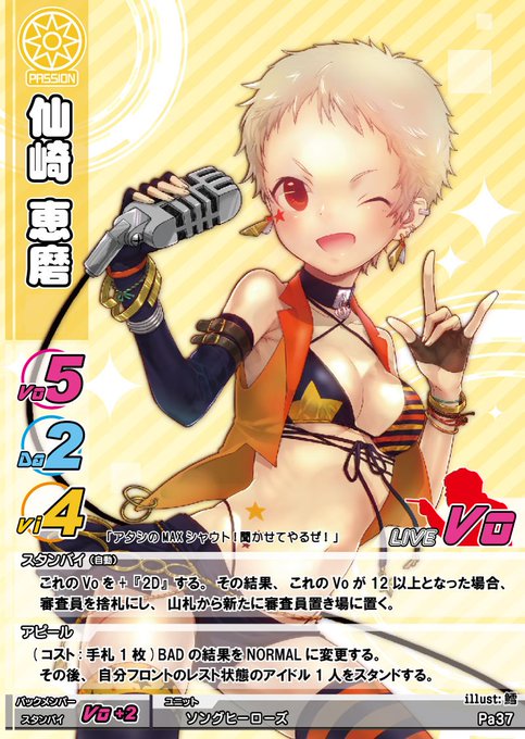 最強ボイスの持ち主、仙崎恵磨さん!特技はもちろんMAXシャウト!ボーカル能力がググーンとアップします!しかし気を付けてください、シャウトしすぎると審査員が帰っちゃうかも… 。うまくアピールしてください!イラストは鱈 @tara_3ppupupu さんです