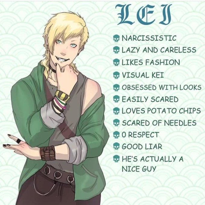 Lei Azaki. Narcissistic ego fueled bastard. Great clothing style. Loves makeup. Lazy af. Loves videogames