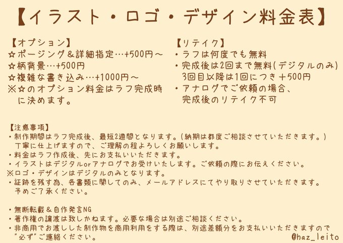 ご依頼の連絡・お問い合わせははずれいと(@haz_leito)またははず明堂(@haz_meido)のDMまで、お気軽にご連絡ください!