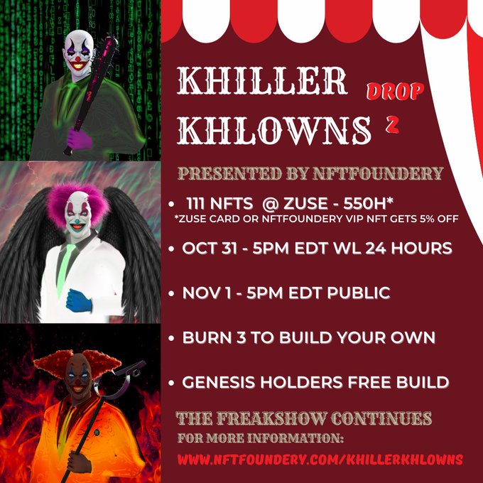 Not long to Halloween and the @NFTFoundery Khiller Khlowns are experimenting with their make-up, ready for Drop 2 on @ZuseMarket .. 5pm EDT 31st October.