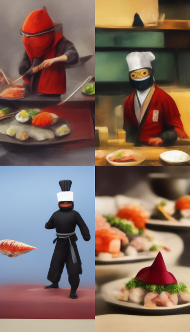 Distant view an empty-handed ninja with keen eyes wearing spiny mask and bulky maroon chef-uniform and hat filleting a tuna and making sushi. Photo realistic. --q 0.25 --stop 85 --ar 9:16