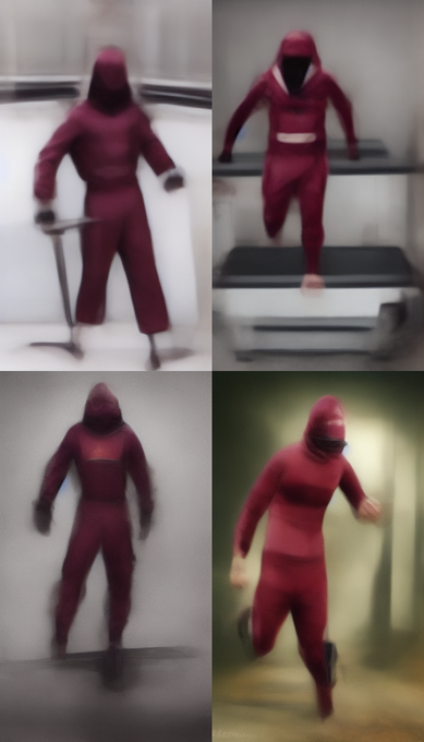 Full-body view of an empty-handed ninja with keen eyes wearing spiny mask and bulky maroon hooded Shugendo-uniform running on a treadmill. Photo realistic. --q 0.5 --ar 9:16