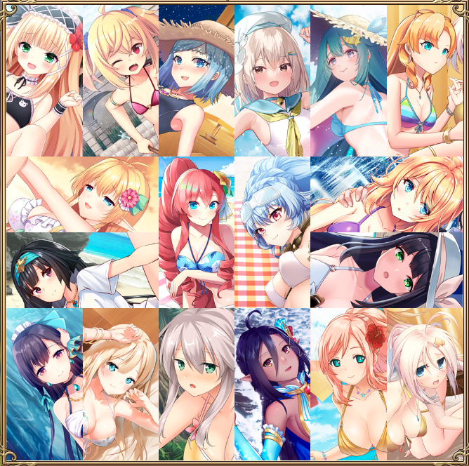 水着立ち絵を並べてたけど空きがあるので 今度は水着CGで埋めようとしてみたけど 同級生から続く斜めイベントCGってトリミングが難しいねとなった #アートワール