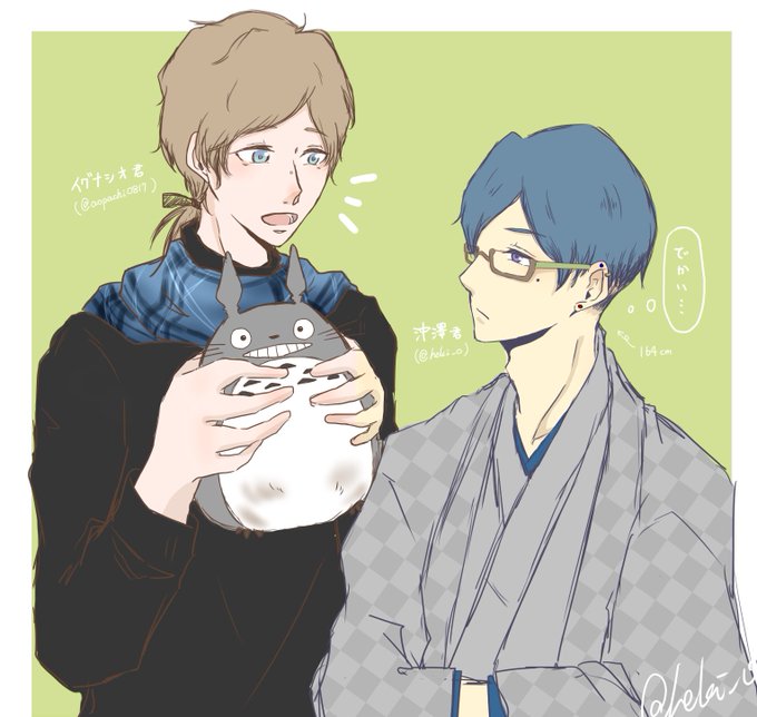 あおぱちさん(@aopachi0817)さんとこのイグナシオ君を描かせていただきました。身長高いと聞いてうちの低身長コンプレックスの子と一緒に…。白米ジブリ好きのイグナシオ君、和服も着たがりそう(OvO)