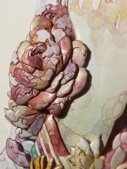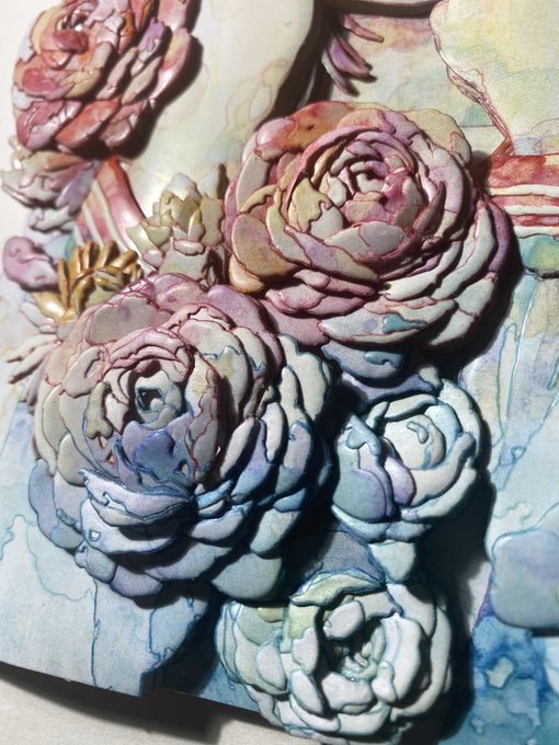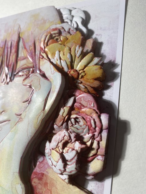 オカユウリさん「心酔」シャドーボックス、オカユウリさんの作品の特徴である滲みによる色の変化をテクスチャのように花びらに貼り付けることで再現しました。また、柔らかな表情も作り込んでいます。