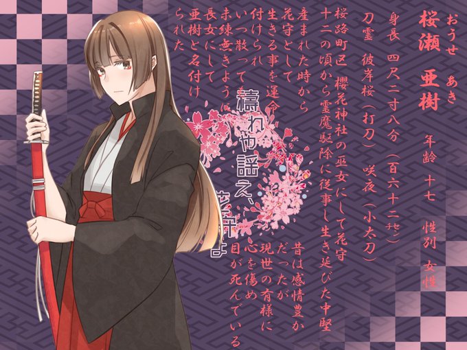 #禱れや謡え花守よ #花守名簿 #花守名簿_花守 #花守_桜瀬家 ちょっと誤字ってたので修正して再UP。 桜瀬亜樹(おうせ あき) 桜路町区の櫻花神社の巫女です。 死にたがりのケのある子ですが、この先生き残れるように頑張ります。 イラストはちゃば様作です。 とても美人さんで嬉しい。