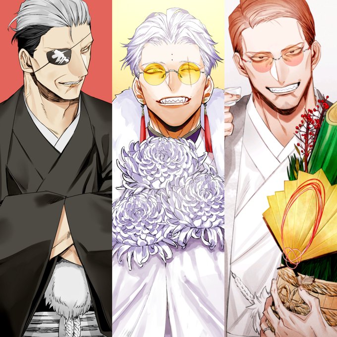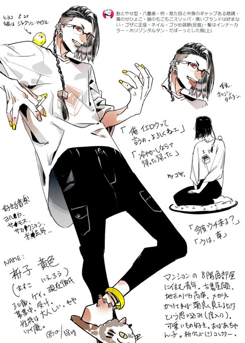 1枚目、左◀から大月加津慈、虎丸秀彰、我妻辰臣。 2枚目は我妻史親(ふみちか)。3枚目は獅童幸也(ゆきなり)。4枚目は比喜田秋(しゅう)。 キャラデザと名前のイメージがあまり乖離しないようには気をつけております( ˇωˇ )