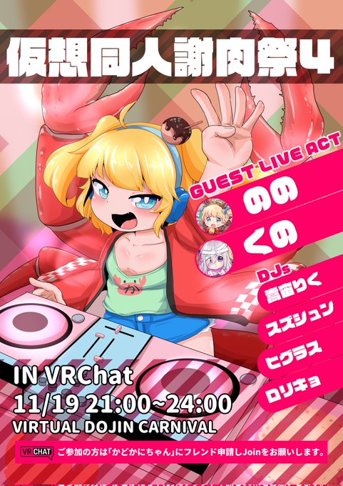 【告知】 仮想同人謝肉祭4( #かどかに ) 📆11/19(金) JST21:00〜 📍VRChat かどかに、またまたVRCにて開催決定!🎉 今回はくまのこべあーずより、ののさん、くのさんにゲストでお越しいただきます!! かわいい同人音楽をたくさん浴びて、最高の華金にしましょうね〜✨