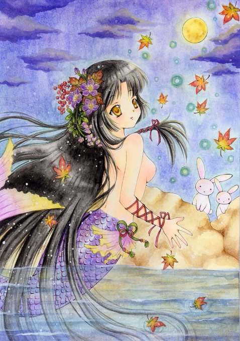 #過去絵を投げて絵を描いた気になろうキャンペーン 3連続で人魚絵🧜🧜♀️🧜♂️ これは和風ぽく、秋らしく描いた絵🍁