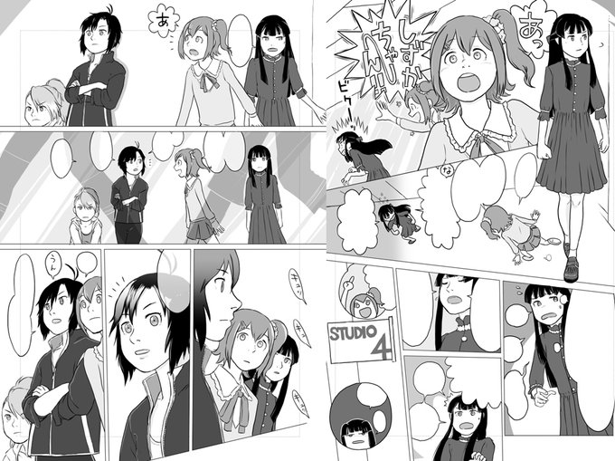 歩がいい感じに描けたページ 未来と静香はスタジオのでかい鏡の前に立っているのだけど、やっぱ鏡の中をちゃんと描いた方がいいんだろうな、ということはわかる…