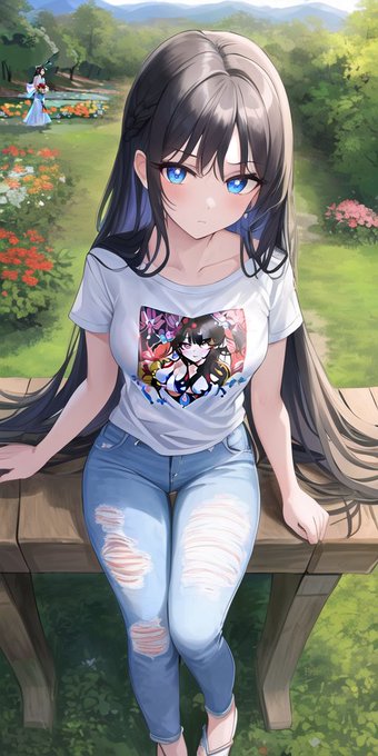 長い黒髪 輝く青目 ダサいプリントTシャツ ジーパンのうちの子です。