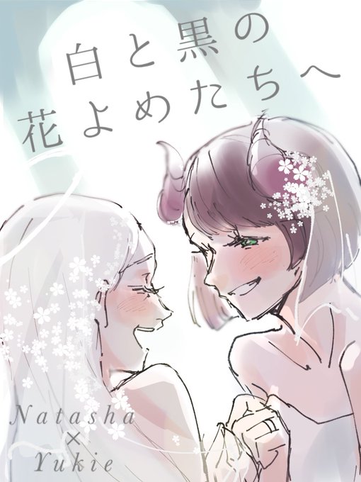 リプきた探索者でエア同人誌の表紙描くやつ ナターシャ・レフィカル×祝寿雪江 『白と黒の花よめたちへ』(全年齢向け) エンデビ自陣がウェディングフォトを撮るお話です