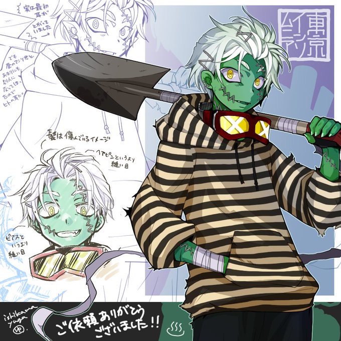 改めまして東京インソムニアの鄙田アンリ(夜の姿)です!!不敵に無敵なゾンビ少年、シャベルで殴って悪夢を潰します!石川絵師様本当にありがとうございました!!おまけも一杯書いてもらった!!!