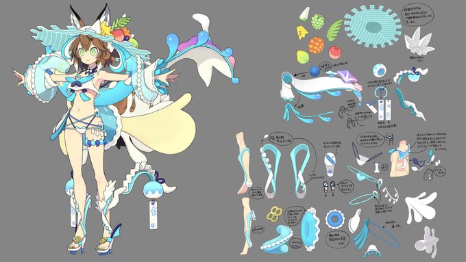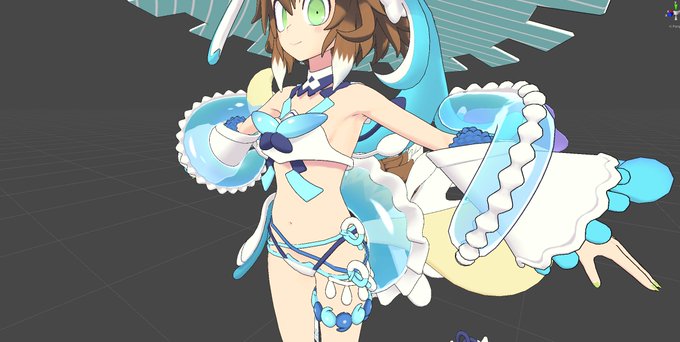 もりのほんさん(@morinohon )に3D用の水着衣装を作って頂きました! 細かいところまで盛り込まれてて、サンダルに風鈴がついてたり、尻尾や袖に浮き輪が付いてたりと可愛い…。ちなみに再現率そのままの3Dモデルはもうできてるので後日公開したいと思います! これが3Dになったの本当に凄いです…。