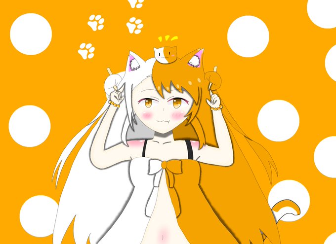 #イラスト #みたらしねこ みたらしねこ先生(@mitarashi_neko) の 女の子フォームのイラストを描きました もう一個も思いついたものがあったので 2枚目はミニキャラでだいふくの壺に入れました 3枚目は透過(必要があったら)(´-ω-`)