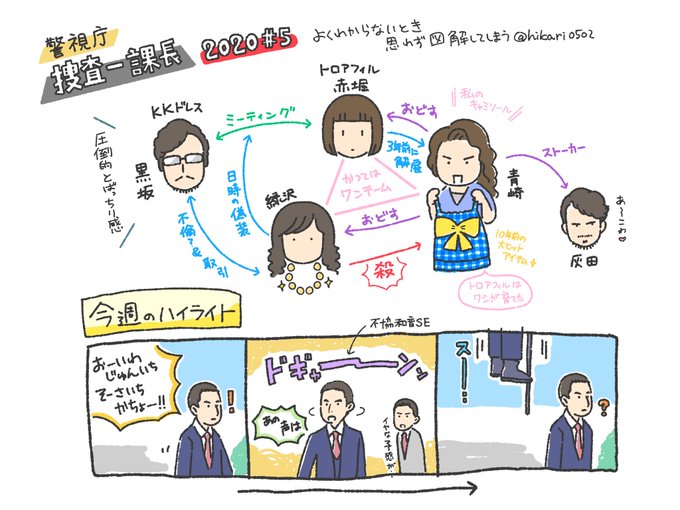 #捜査一課長 を見返していてよくわからないと図解するのだけど、今回は色つけまでしてみました。