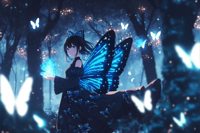@prompt_battle 青い蝶々が好きなので朝と夜の森にいる青い蝶々娘をそれぞれ1枚ずつ