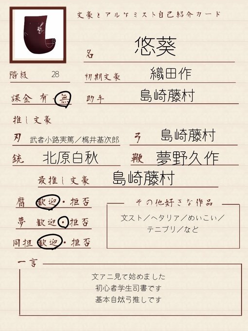 #今年ももう終わるので文アル好きさん繋がりませんか #文アル好きさんと繋がりたい #文アル自己紹介カード 自然弓&白i樺が好きです(♡˘˘)* ふぁぼりつからまわりまーす( *´꒳`* )