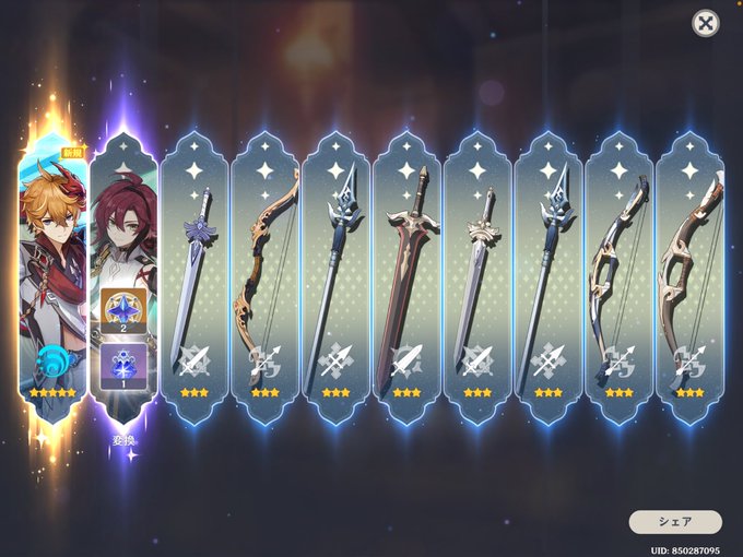 10連で旦那、30連でタルタリヤ、50連で1凸しましたありがとうございました。レイラちゃんもゲットしたし史上最高の神ガチャだった。